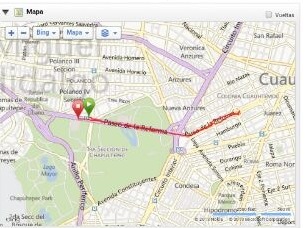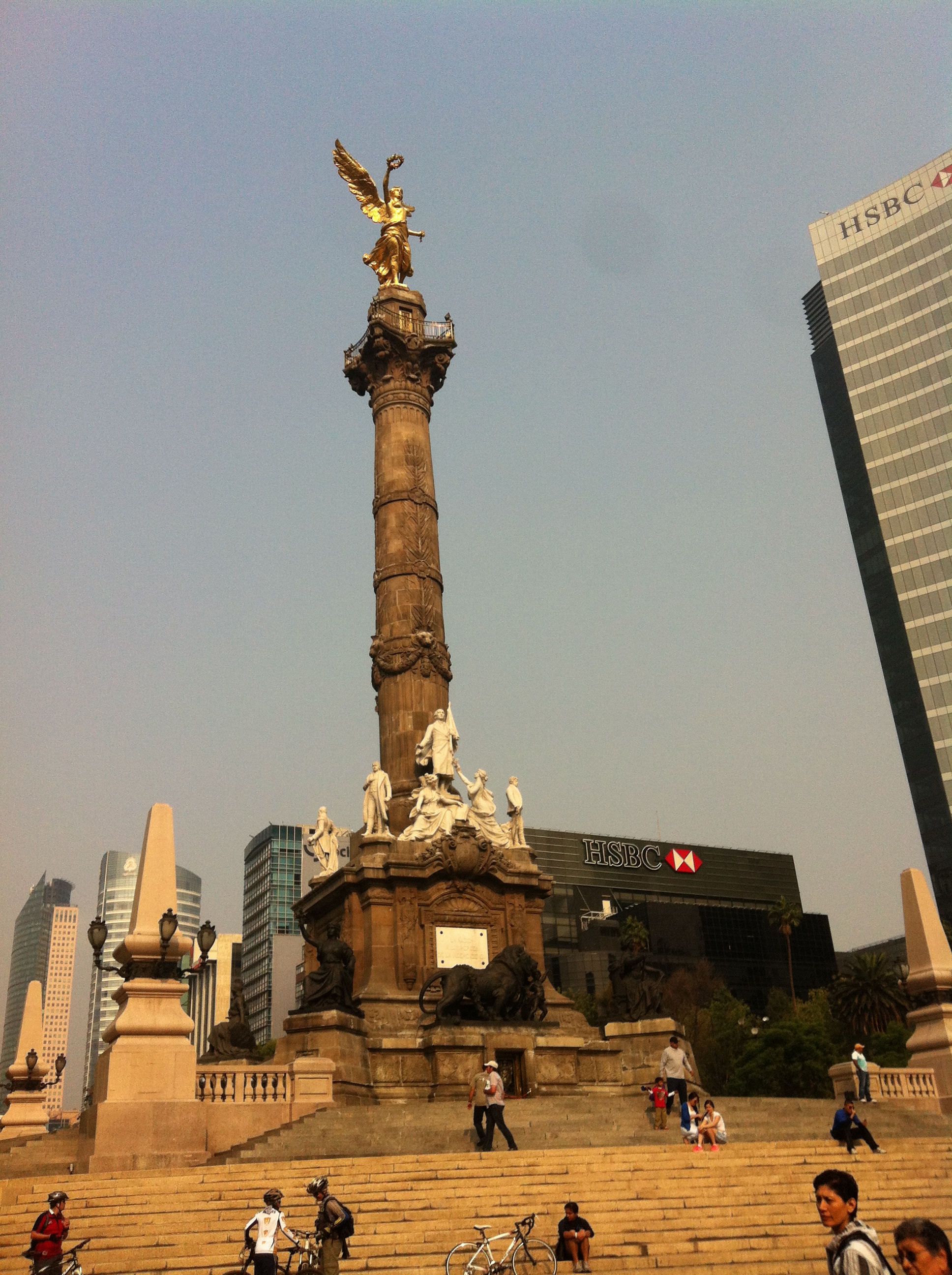Así pues, me incorporé en el Paseo a la altura del bosque de Chapultepec, sin saber muy bien hasta donde llegaría ni qué me encontraría… Mi sorpresa al llevar a penas un kilómetro es ver de lejos dos monumentos que había visto solamente desde el coche: la fuente de la Diana y el Monumento a la Independencia, más conocido como ‘el Ángel’ de fondo.