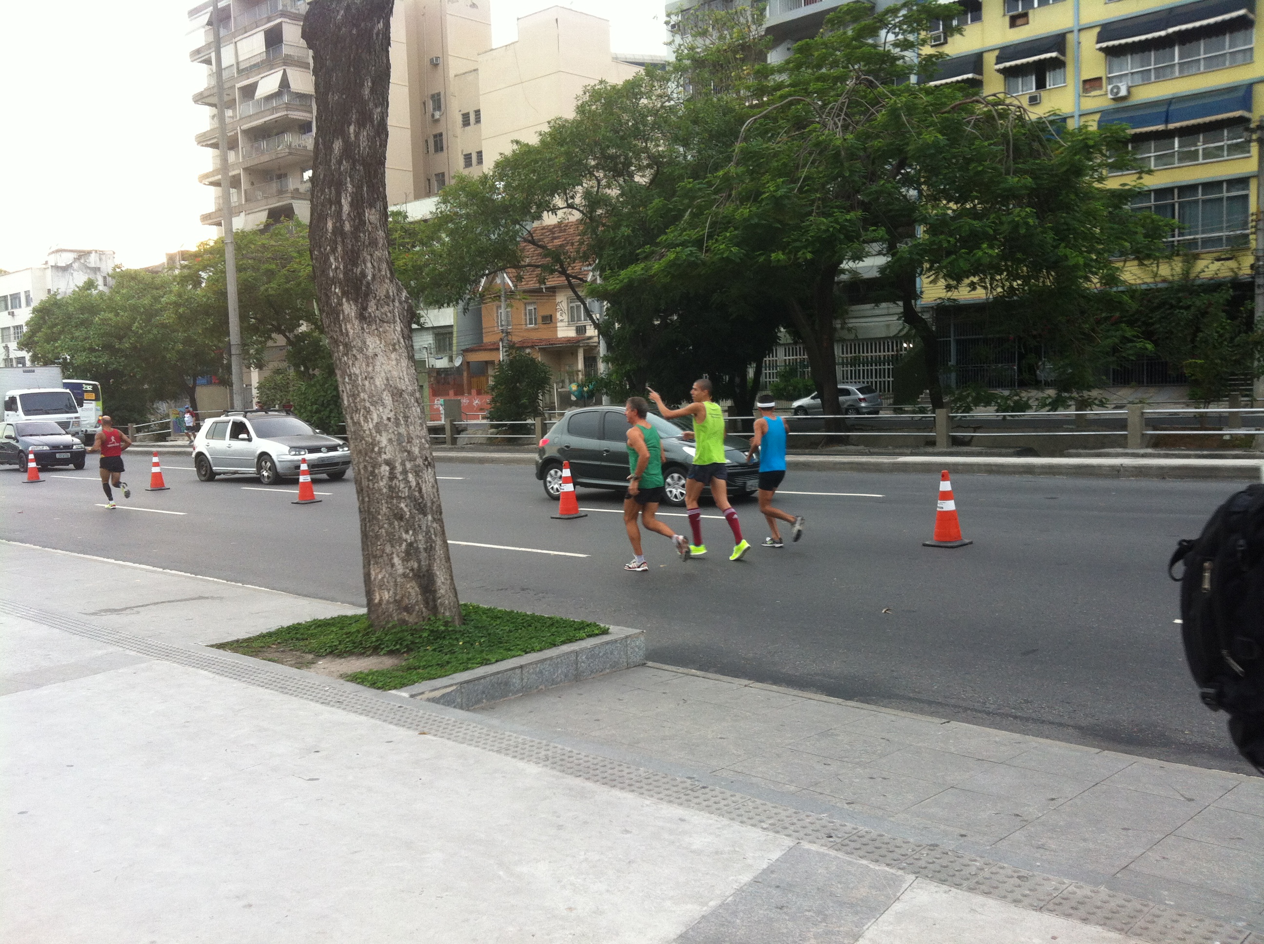 La verdad es que al principio sufrí un poco, sobre todo porque a las 7.40 de la mañana estaba sudando como si estuviera en spinning. Y eso que estaba nublado, la humedad es brutal. A pesar de las molestias y el calor, intenté concentrarme en mirar alrededor y guardar esas imágenes en la retina. Realmente era todo muy feo jajaja, pero bueno, me iba fijando mucho en el entorno pero sobre todo, en la gente. Especialmente en el hecho de que, a pesar de ir bastante despacio, en todo momento formábamos parte del pelotón y adelantábamos mucha gente!. En Rio la gente corre despacio. Y raro. Y de esto saldrá otro post. Pero bueno, a lo que iba, me llamó mucho la atención adelantar gente caminando antes de llegar al km.1. Y resulta que hay gente que hace las carreras caminando, y a nadie le importa. Eso sí, si no hay cajones, aquí lo de la salida organizada por los rápidos delante / los caminantes detrás, tampoco se lleva. Al final por lo que estoy viendo por los mundos de Dios, es que da igual que seamos altos, bajos, rápidos, lentos, blancos, de color, gordos, flacos, mexicanos, americanos o brasileños… hay cosas, que son inherentes a la raza humana.